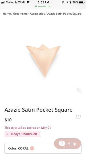 Help! My bridesmaids dresses are supposed to be coral and I wanted to get my bridesman’s pocket square from Azazie. Ideally, I’d like it to be in the deep shade like the first photo here, but the color looks really pale on their website. I’m not sure...