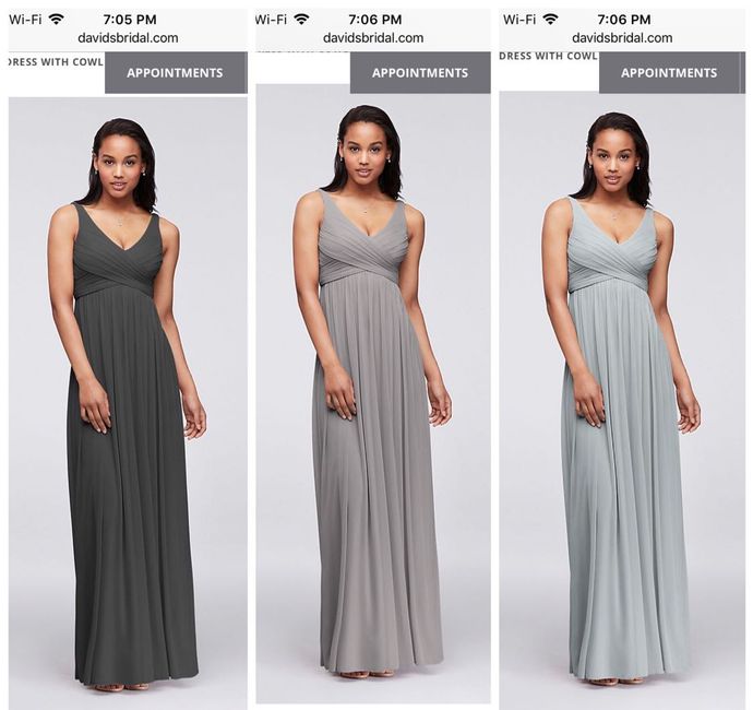Hi everyone! So we are doing shades of grey for the bridesmaid dresses (picture attached for the shades). What color suit for the groomsmen would go well with these? Our venue is a renovated farm so don’t want anything too formal. Not 100% set on...