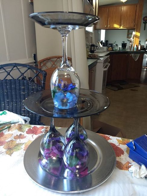 I made these with materials at the dollar tree and household glue! It came up to about 15$ per piece! I made 3 of them! My wedding is universe themed so the colors are blue, purple, black, and silver. Two of the serving trays are for cookies and...