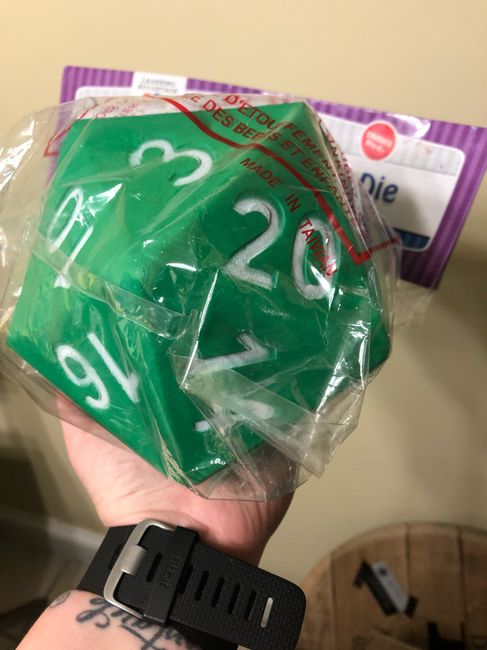 My grande D20 has arrived. We’re borrowing the idea of instead of clinging glasses to have us kiss folks have to roll the dice instead. If they roll 11+ we kids, if they roll 10- they have to find someone to kiss. I’m far too excited for someone who...