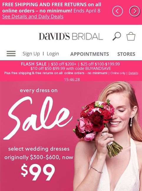 There’s a sale today! It’s short, but if you’re ready to make purchases with David’s Bridal and just haven’t pulled the trigger, doing it now could get you some nice discounts.