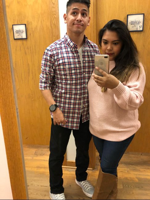 So my FH and I have an engangement photshoot at our venue next week. I’m going for a fall theme shoot. We tried on different options and liked these two best. Everyone seems to go with the gold sweater and I’m unsure. I recently lost weight so I’m...