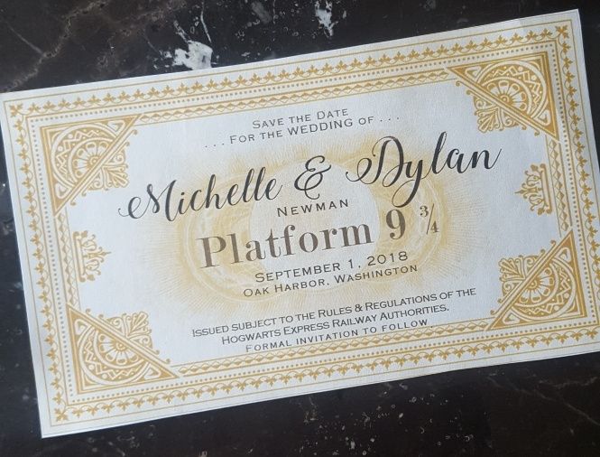 I'm doing a nod to harry potter and we are designing the save the date cards to look like tickets to the Hogwarts express. The actual invitations will be printed on parchment and placed in a brown paper envelope closed with a red wax seal (like the...