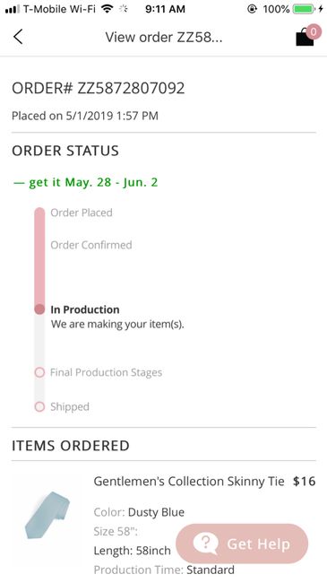 I ordered a tie for FH from Azazie about 2 weeks ago and it still says “in production” and the delivery date has moved further away... now the tie potentially isn’t arriving until the day we leave. It is for our engagement pictures and of course we...