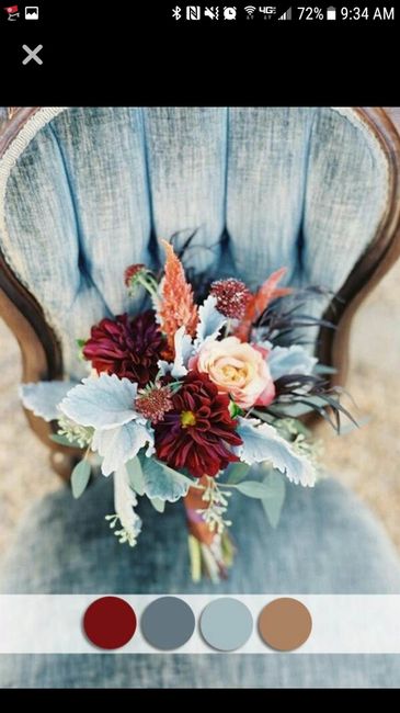 Have you or anyone you know done a dusty blue with grey and burnt orange accents? I fell in love with the dusty blue color and wanted dusty blue, grey, and blush/rose gold, but my FH recently said he likes the idea of orange as an accent. The dusty...