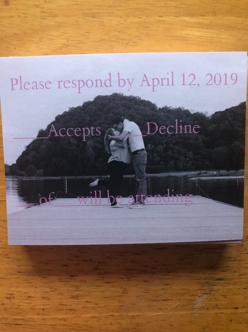 My invitations came in today. I'm beyond excited to start putting these together. Sorry for the bad lighting in the pictures. Front Back of invitation Rsvps