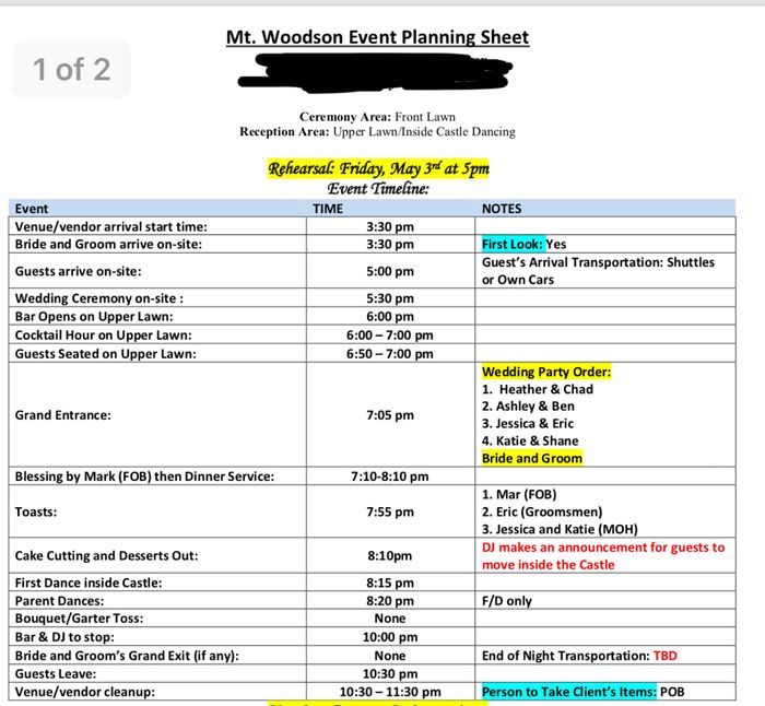 Hi everyone. I'm getting married on 5/11/19 and my caterer asked for my timeline. My ceremony will be from 4-4:30 pm & Cocktail Hour 4:30-5:30 pm. The reception ends by 10 pm. That's as far as I got lol. My photographer feels he needs more than...
