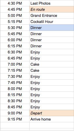 Hi everyone! I'm trying to DIY my wedding and come up with a good schedule. I've only been to 1 wedding before so I was hoping to get feedback on what i've come up with. What do you think of this schedule ? The wedding is on a Monday. Our reception...