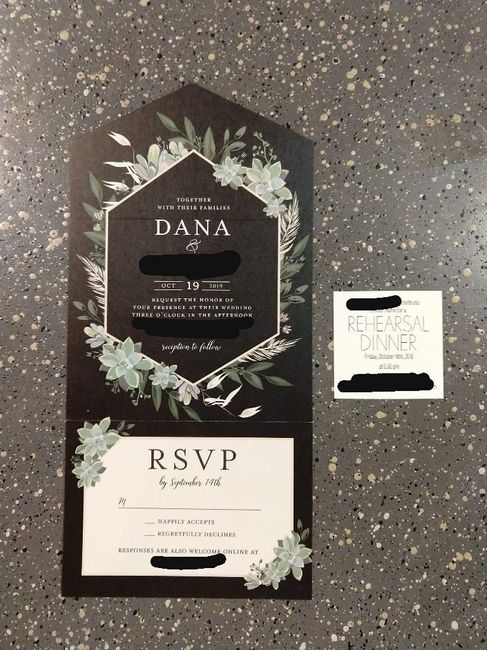 We used Minted all-in-one wedding invites and added Vistaprint business cards for rehearsal dinner invites! Utilizing sales, it came out to less than $2 each, including the stamps!