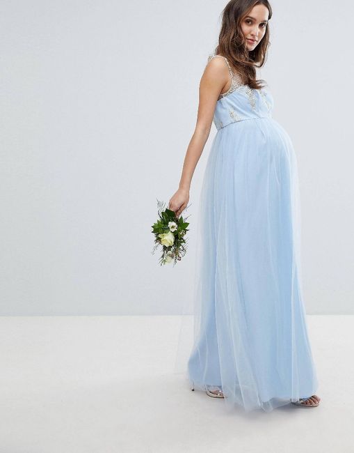 Anyone have any recommendations on where to look for a maternity bridesmaid dress for a very pregnant lady (not me)? Also, anyone recommend any particular styles or fabric? I am leaning towards a floor length gown. It will have to be sky blue because...