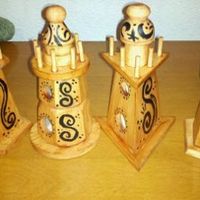 NOT done yet by any means...but this is what I have so far. Spent 97cents on each little bird house...so far they are stained and hand painted with those designs. Still going to add feathers, ribbon,...