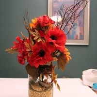 So I am working on my centerpieces. In the first one I have wrapped a piece of wheat around the top of the jar, and the second I have stuffed the top with leaves. Which do you guys like better? Or...