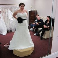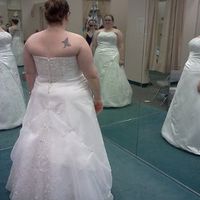 Sunday, I went to try dresses on with my mom, FMIL, MOH, and a BM. These are the 4 I like enough to post. What do you ladies think? Pic 1: I would get the bow in a color similar to the dress. Pic 2:...