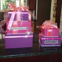 I didn't want the basic birdcage, or white card box...nor a wishing well...I saw boxes like these online that sold for upwards of $125!!! Yea right!!! My future Aunt took on the project and...
