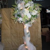 More of the decorations are coming along.....here are the latest: DIY Topiary Trees (with xmas lights) that I jazzed up to match with our bouquets, etc. I also posted a few of the centerpiece ideas...