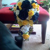 So this is bouquet #2. The first one started out looking pretty but somehow lost its shape and looked more like a funeral arrangment so we took it apart and started again. THe lighting isn't great but...