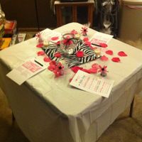 What do you ladies think? This is for a six to ten person table. (Pictured: Zebra Charger Plate $1.50, Ivy Crimp Bowl $.94, Water Beads, Kissing Bells Favor, Ispy/Crossword, Petals, and...