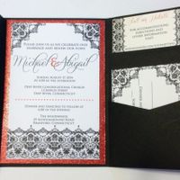 I haven't posted in awhile but here are my invites! I designed them myself! The picture makes it look orange, but it's actually red glitter paper.