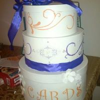 Well I worked on my card box "cake" today... It's three tiers, has a slot on the top tier and reflects our colors orange, purple, and ivory. These are bad cell phone pictures. I used our monogram with...
