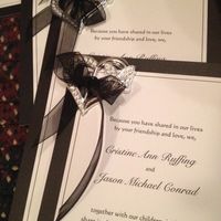 Well I am back from my night alone at camp. I took a bunch of stuff and got so much done. Below are our invites. I had them printed at Vista Print then I added the ribbon and heart/butterfly buckle...