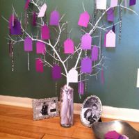 Just finished working on my wishing tree! Started off with a glass vase. Then I cut a tree branch from the front yard. I spray painted it white and added strings of grey crystals. I purchased grey...