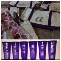 I got my bridesmaids totes ($4 each) and ironed on their first initial. I also got them makeup bags ($5 each) and tumblers ($4) each. In the makeup bags I put a little travel size...