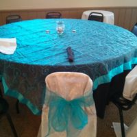 Okay got my sample linens in today. Went to the banquet hall and layed them out. We decided on Black table clothes and White chair covers with the turquoise overlay and sash. We have some different...