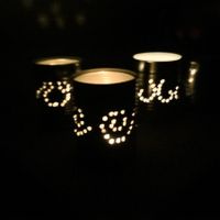I can't believe I'm almost done with this stuff. These are our hand-stamped napkins and tin luminaries I made, followed by my table mock-up (hard to do on such a small table) with our palm leaf...