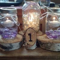 This is what we decided we wanted to do for our centerpieces and our table numbers. I didn't care for the thin ribbon I tied around the jars Opinions: !) Should we use thicker ribbon or burlap to tie...