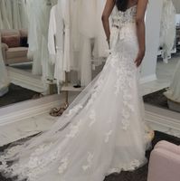 I could really use some help! I tried on dress #1 early on, and it stuck in my head. I kept comparing everything to dress #1. (Excuse the pic quality, this salon had poor lighting.) I tried on dress...