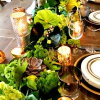 I want to see what everyone is doing???! Here's a small mockup of our floral table runners. They will be about 20" wide and run the length of each 8' table. Lots of mercury glass and some taller vases...
