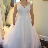 My dress is all lace with pearl and crystal accents. Do you like it better with or without the belt? This was at my final fitting today! So excited to take it home!
