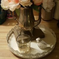 So I'm organizing my center pieces on my own and am actually pretty proud of myself. Each table will be a little different but the flowers will be held by a mercury glass vase or silver tea pot with...
