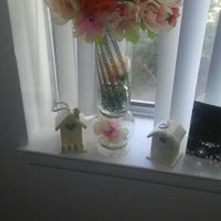 I have to add some more flowers and the rest of the rhinestones on the vase and our bird houses... Our theme is Love Birds!. What you guys think??. Everything cost 20!. I glued everything on......