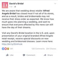 I just had the fright of my life, my florist told me today my dress store was closing. I called and its not mine but it is Alfred Angelo! My Roseville, California AA store is open till 7pm and then...