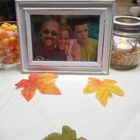 I put together a mock centerpiece. There will also be a small pumpkin as well. There are 2 different pictures and some tables will have vertical pictures back to back. Opinions on more or less please ...