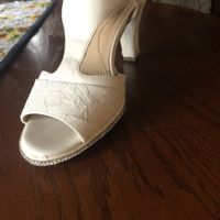 So I just wanted to show off my work here. I used some strong fabric glue and a lace ribbon to fill the lace on the front and on the heel. We also found these small rhinestones from iron ons. We...