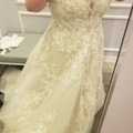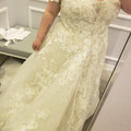 So different lighting makes the dress look yellow, it's not yellow lol it's ivory/stone. Oleg Cassini from David's bridal. My street size is a 14/16, I ordered a 22 (wedding sizes are weird) I'm...