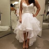 I tried on about 5 dresses at David's Bridal and was on a budget! I loved how this one looked on my pear shape figure. It is beautiful with a little bit of funk and it seemed perfect for my back yard...