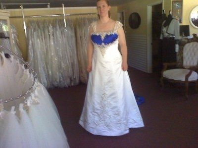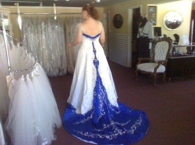 I just want to know if anyone has ever seen an Alfred Angelo dress with this color trim on it? If so, is it pretty? Does the color appropriately compliment a wedding dress? I want to know before I go and see it and am totally bummed that my dream dress doesn't look right. The first picture is the dress I have chosen with the "Tealness" colored trim. The second is the back of the dress.
