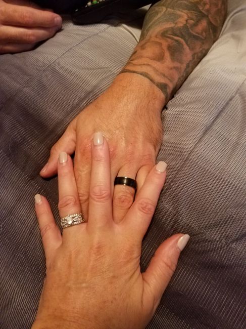 Hi all....I've been hesitating to ask this (as I feel it may be a silly question...lol) but I'm still unsure if I'm supposed to wear my ering on my finger during ceremony and then he puts band on, or go bare fingered?? LOL I have two half eternity bands and had just one soldered to bottom of e-ring, and was thinking I'd wear and then he'd put second band on completing the set? I only got one band soldered as I'll wear it both different ways depending on the look I want to mix it up. Does this sound right, or do I go bare fingered for the ceremony? Pic of soldered and have matching seperate band that he'd put on. Thank you. :+)