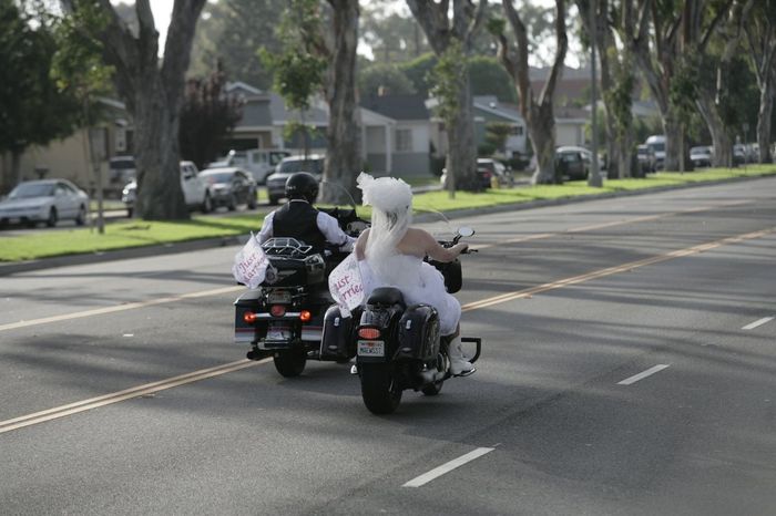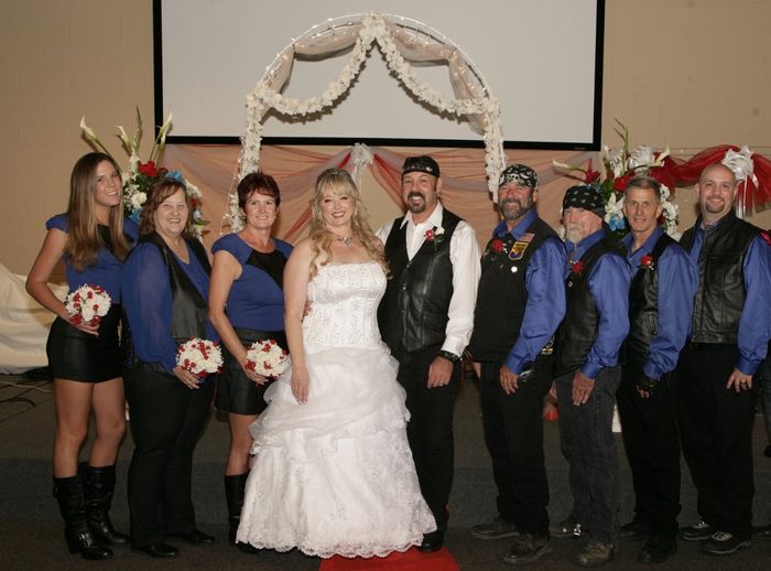 I set out to have a biker wedding - we met on a biker dating site six years ago. I wanted to do it myself on a small budget. I did a lot of searching and found very little about biker wedding but I did get a few hints from wedding wire. Well Ladies I am proud to say I did it all, including my dress and band for under $2000.00 dollars - in Los Angeles (where prices are ridiculous). A quick rundown of my ceremony. Apx. 100 people in our small church. I put together a power point of pictures and music to play while people are being seated. Men in birdal party will be dress in black jeans, blue dress shirts, leather vests. Women in leather skirts, leather boots and blue cute shirts with leather vests. Bride and groom will ride in on motorcycles. I have a beautiful full wedding dress and white biker boots. Flower girl with motorcycle helmet to pull petals from. Ring bearer with Harley bear and rings attached. Colors red, white, blue. More info if anyone interested.