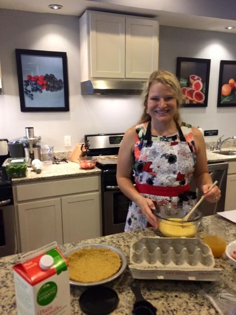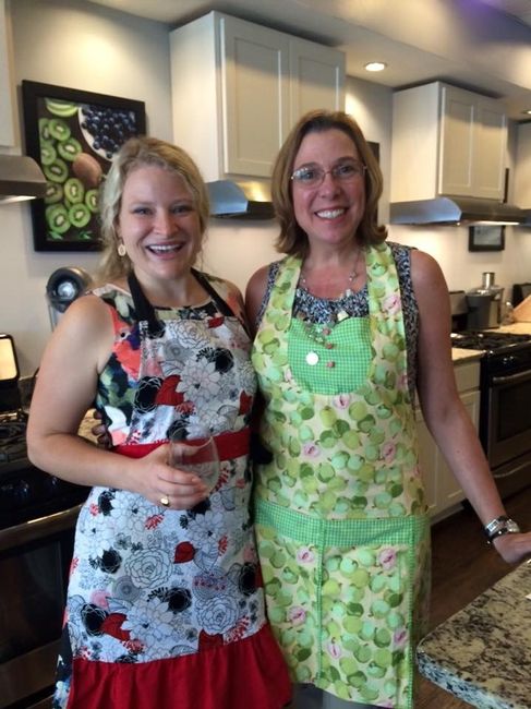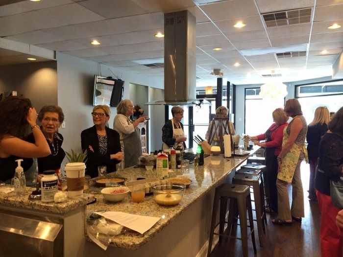 There was a table with wines, juices, and nectars. When we arrived, there was a delicious spread of bruschetta. The lady who owns the business then let us choose what recipe we wanted to cook and the ladies split into groups. We made bruschetta, spinach salad with pineapple dressing, flour free blueberry muffins, goat cheese stuffed medjool dates wrapped in prosciutto (delicious!!), quinoa crusted quiche, and strawberry sorbet.