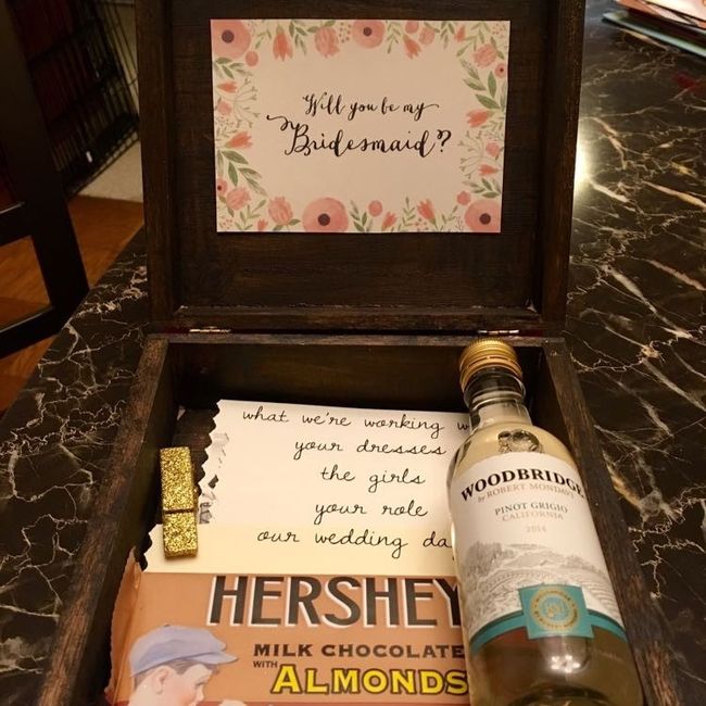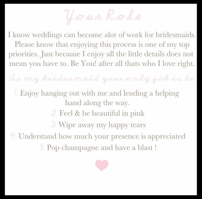 I have crafted an adorable box for all my girls filled with champagne bottles with stickers from etsy, chocolate, bubble gum, nail polish, rose petals, little notepads with glitter letters and lots more! For my last task I wanted to put together a little detail sheet such as information about the wedding, their role, the girls etc. I have been working on this so long I am racking my brain for ideas! I know I saw some girls who did a newsletter as well.. Anyone have any templates or ideas on how/where they got inspiration for theirs? THank you so much!!!