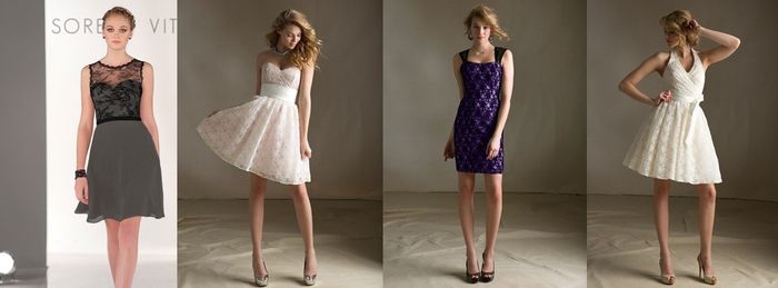 I prefer the lace overlay dresses, but they are all black lace over purple (for the bridesmaids) or over charcoal (for the maid of honor)