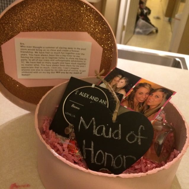 I want to create a cute personalized box for each of my bridesmaids and hopefully give to them at my engagement party..anyone have any photos to share if they made one? I was going to do a mini bottle of champagne, some bath stuff and maybe a monogram mug, etc.. would love to see photos of what you came up with ...... Thank you in advance