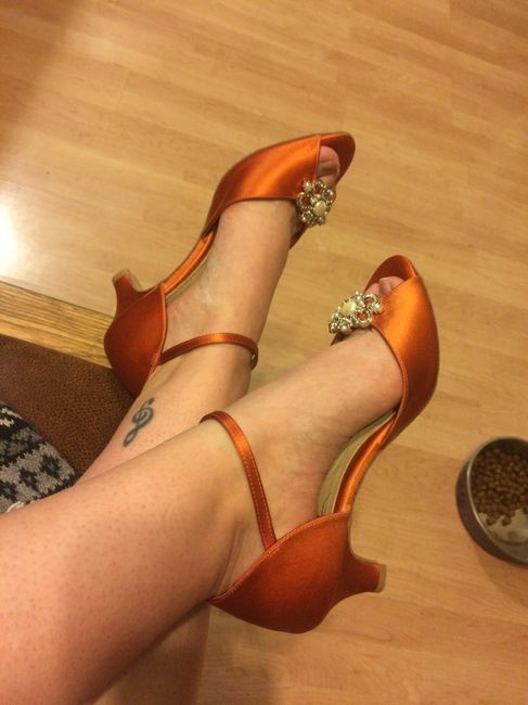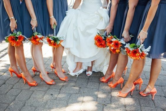 I let all the girls know at the beginning of the year they had to order their dress from Azazie (I specified color and length, but style was their choice) and shoes from Dyeable Shoe store, because we had a bridal party card set up with a custom orange dye lot mixed (again any style of dyeable shoe).
