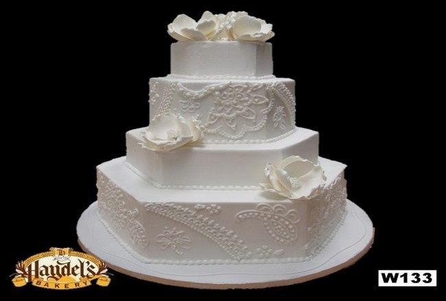 Here's our cake. Our bakery has a base price of $2 per serving (all buttercream, 3 different flavors inside). So we are expecting 200-250 people so our cake is 200 servings so $400. Then they charge an extra $100 per tier design, so like the picture we had to pay another $200 for designing 2 tiers. Also the triple layers (notice the design layers are thicker) is an extra $50 per layer, so another $100. Total our wedding cake was $700. Not exactly what I wanted (I wanted simple with gold spray but they didn't offer it the way I thought and I rather not experiment). The groom's cake was about $160, and the delivery ($100) and taxes basically brought our total to almost $1,000. Which is what I budgeted for cake anyway, thankfully the cake was the one thing my dad volunteered to pay for. It made making the decision so much easier. We could have gone so much cheaper (like half for the wedding cake) but the groom's cake we liked is Haydel's specialty (were having a 4 tiered king cake with white, black & gold and a little crown). Hope that helps.