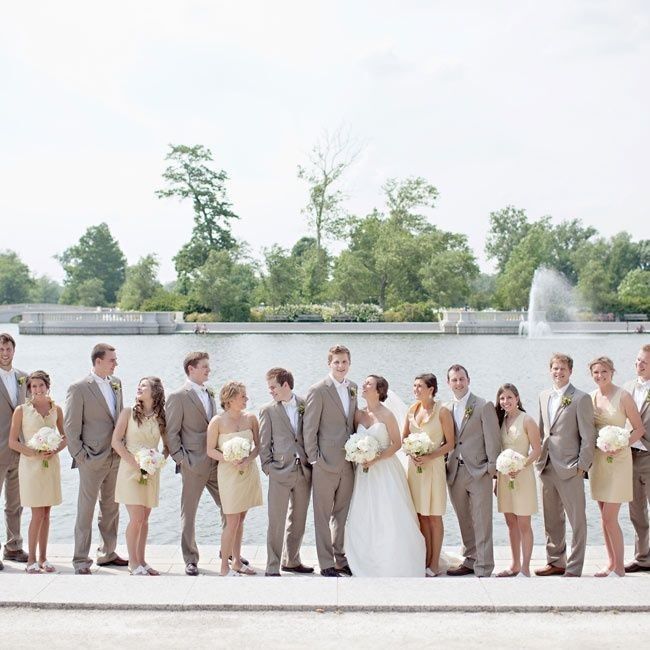 I am getting married next spring. I didn't go out searching for a champagne dress, however I fell in love with one. I originally planned on having gray bridesmaid dresses, but now I am concerned on how the two colors would mix, and what color suits the guys could have. If anyone has PICTURES of their champagne dress, against their bridesmaid dresses, I would greatly appreciate it!