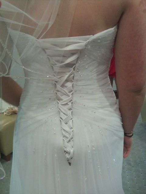 My dress has a corset back and I was wondering if anyone can tell me what the corset "should" look like when its tied, like how wide should it be at the top? The pic is of when I tried on the sample at the store and she said it fit almost perfect. Should the lacing be wider/more narrow/ or is it good like that? I ordered the same size as the sample but it is likely to be a little smaller because it wont be stretched out from a million people trying it on. Thanks!